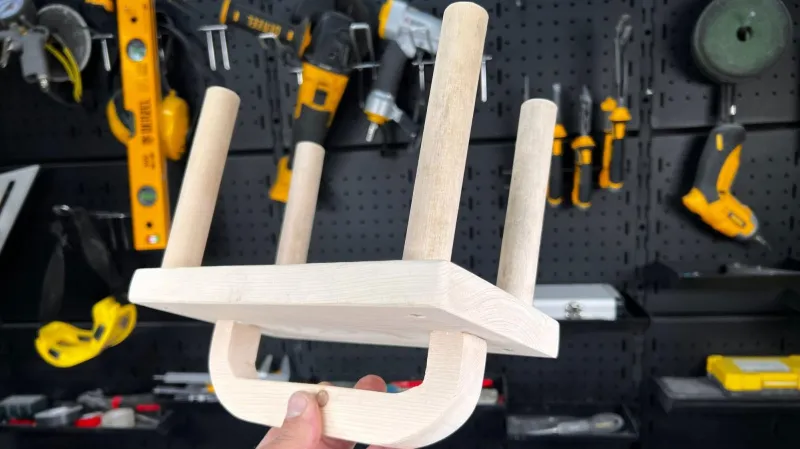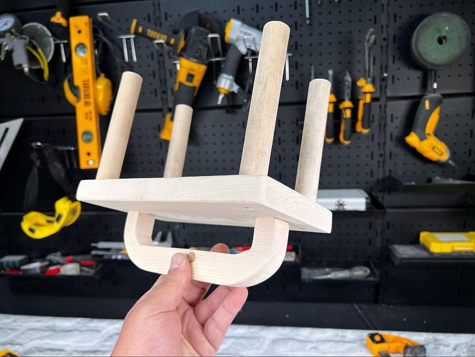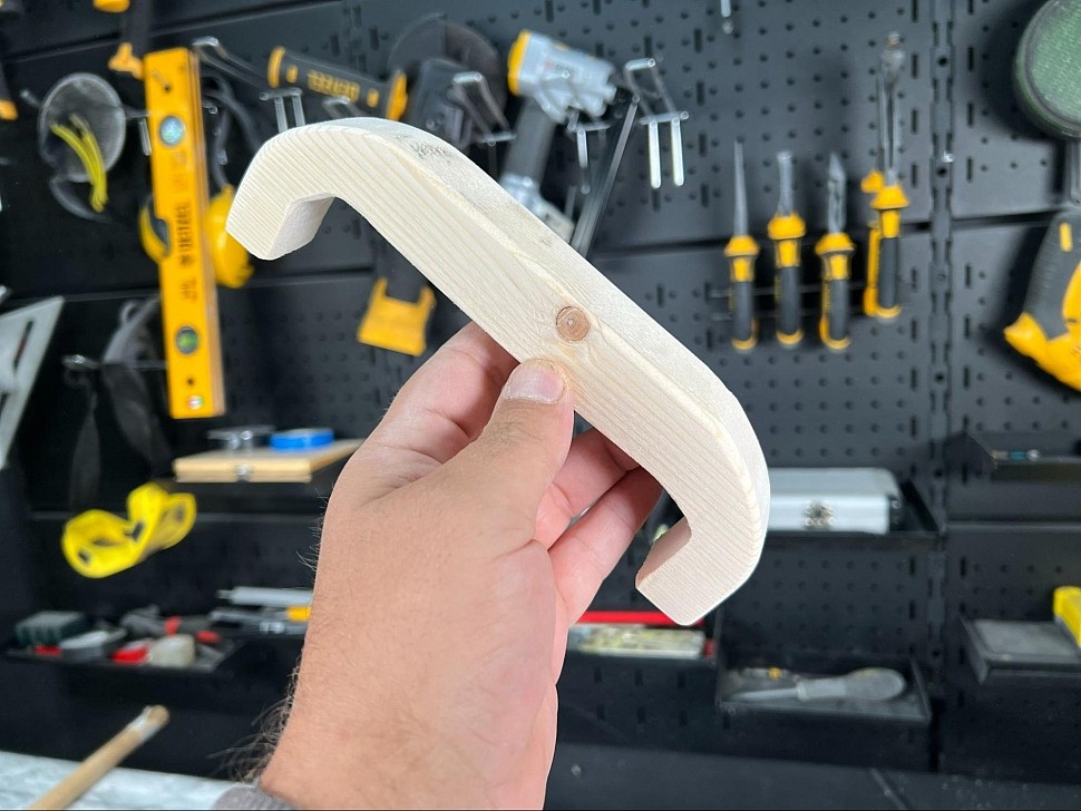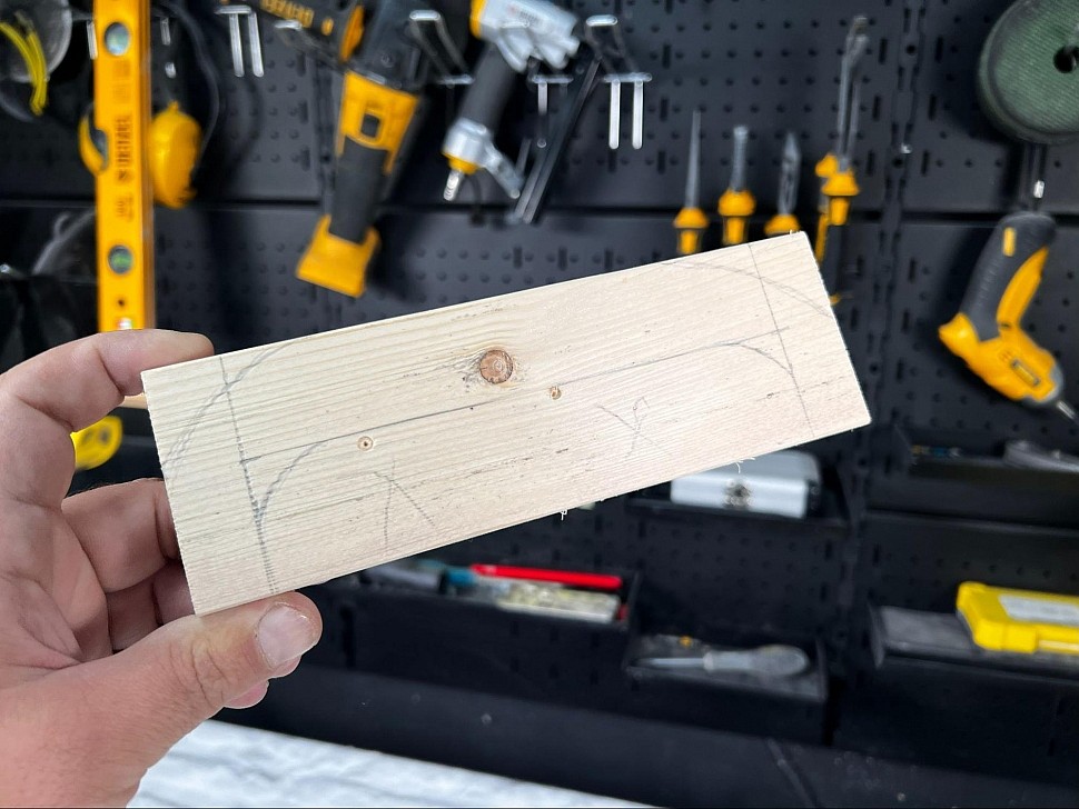 Готово! Пока откладываем доску в сторону. Теперь нам понадобится небольшой брусок, на нем мы будем делать удобную ручку для нашей самоделки. Рисуем на бруске что‑то вроде формы дверной ручки, чтобы потом было удобно держать инструмент в руках и легко направлять его по грядке при посадке чеснока.