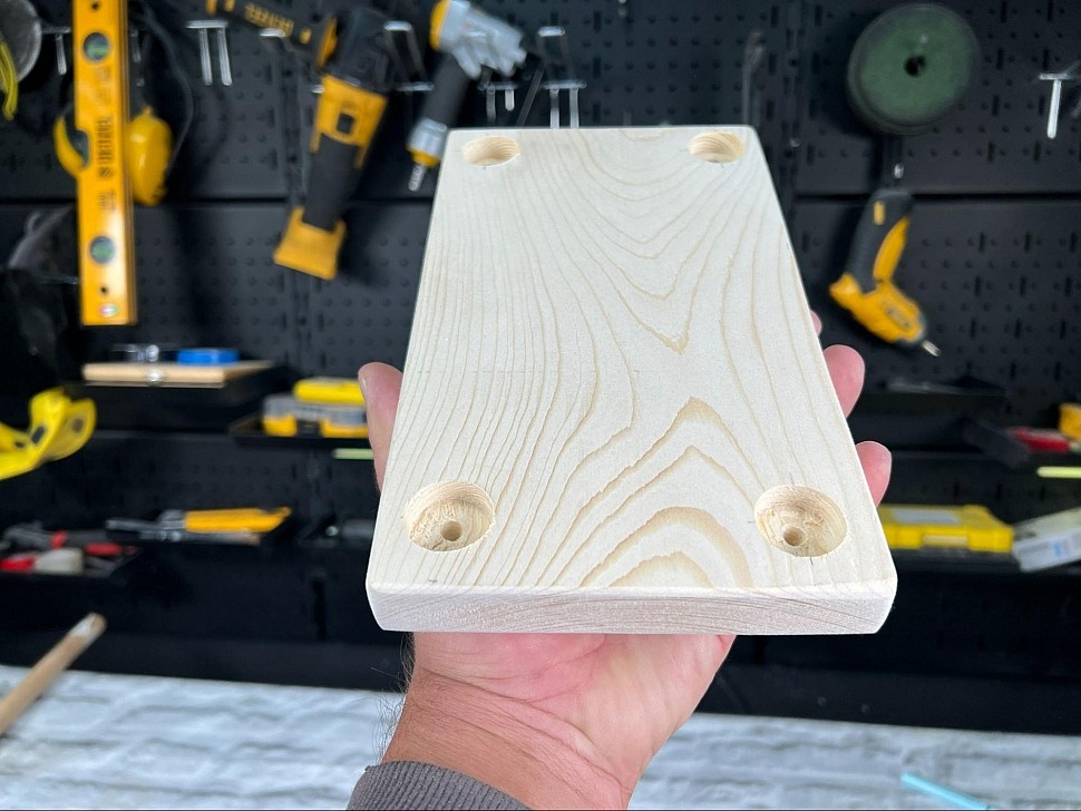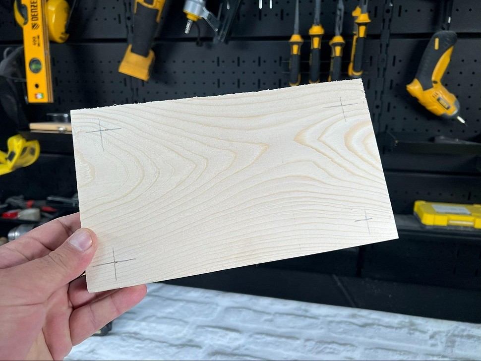 Отступаем от каждого края доски примерно по 25 миллиметров и ставим метки, здесь будут располагаться наши отверстия. Это нужно, чтобы углубления получились ровно по центру и не слишком близко к краю, иначе дерево может треснуть при сверлении. Для удобства можно воспользоваться линейкой или угольником, чтобы разметка была аккуратной и симметричной.