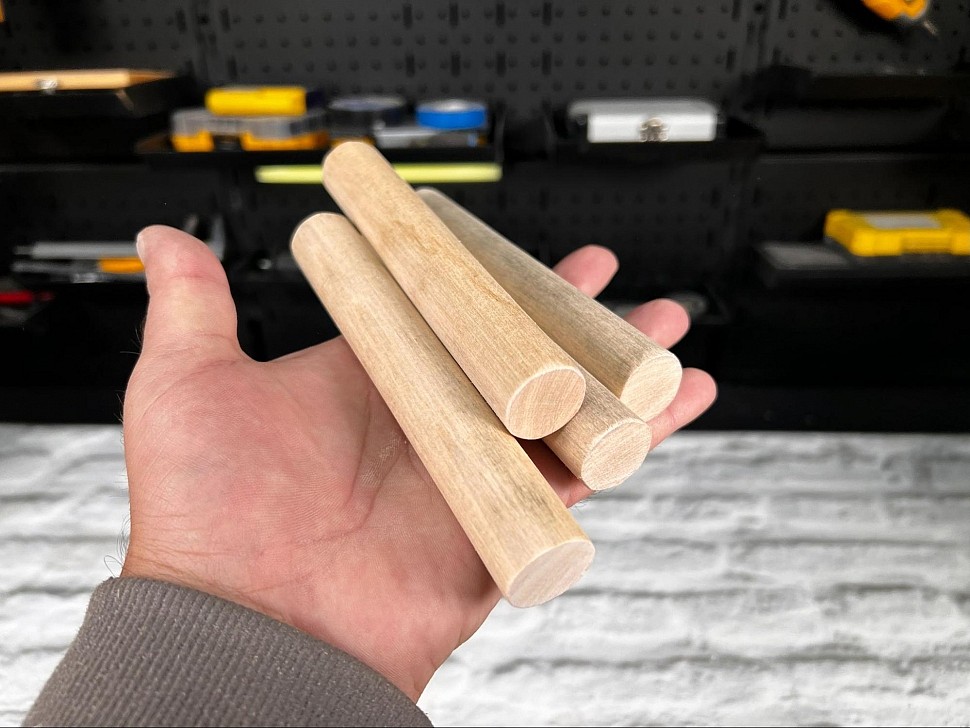 Далее берем черенок от граблей, в магазинах они продаются как раз диаметром 24 миллиметра, совпадающим с углублениями, которые мы сделали в начале статьи. Отрезаем из него четыре одинаковые части длиной по 150 миллиметров каждая. Именно эти заготовки станут направляющими для нашей самоделки, обеспечивая точную и удобную посадку чеснока.