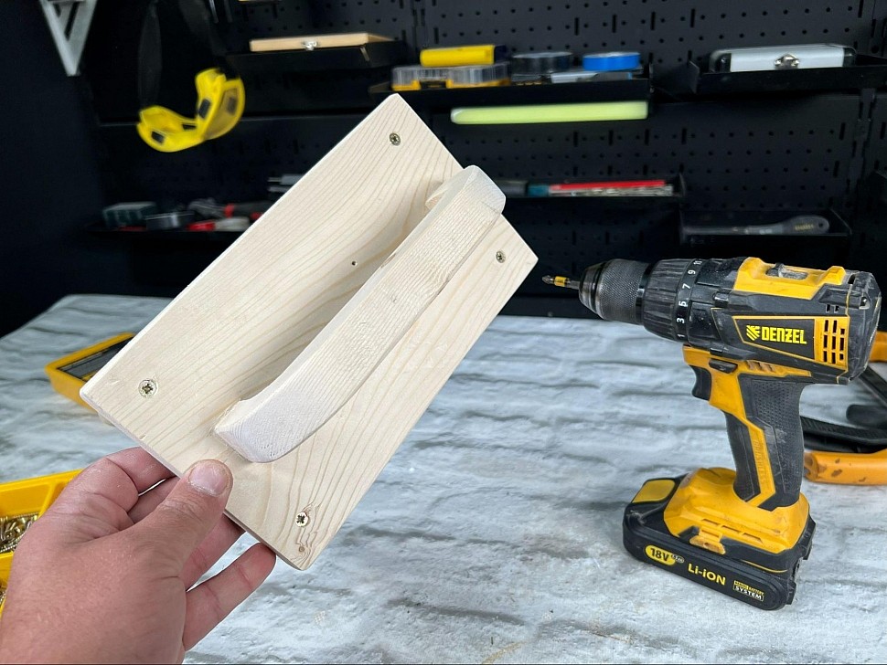 Сначала фиксируем ручку. Для этого используем клей ПВА и саморезы, клей обеспечит дополнительную прочность, а саморезы надежно закрепят ручку на доске.