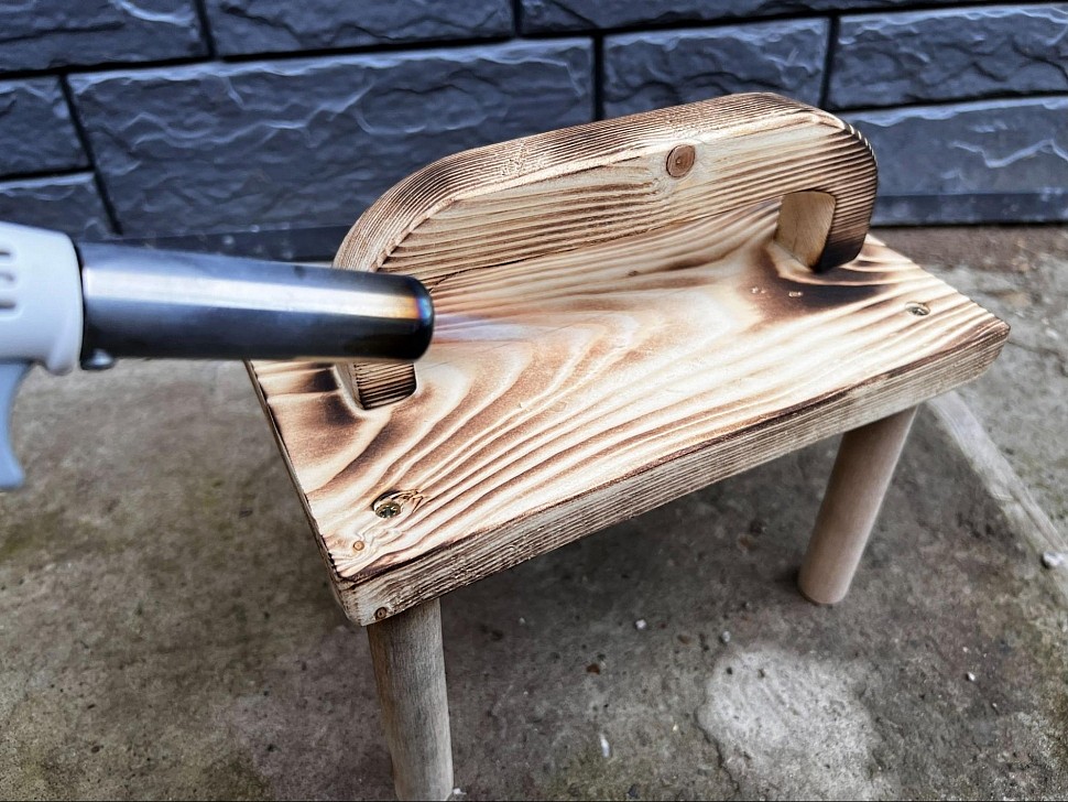 Далее обжигаем нашу самоделку газовой горелкой, чтобы поверхность стала более прочной и устойчивой к влаге. Такой прием помогает защитить дерево от гниения и делает ее долговечнее, особенно если вы планируете использовать инструмент каждый сезон.