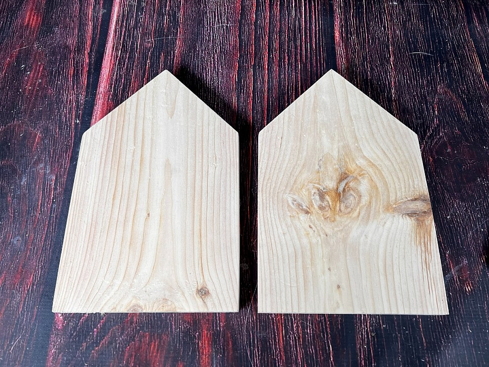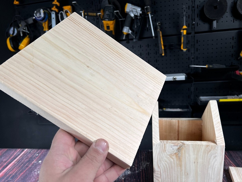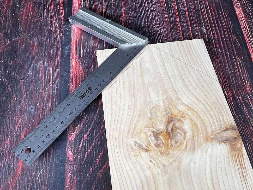 Далее делаем разметку под крышу: от центральной точки чертим линии под углом 45 градусов, чтобы верхняя часть получилась аккуратной и симметричной. Такая форма крыши не только красиво выглядит, но и помогает дождевой воде стекать вниз, защищая домик для птиц от влаги.