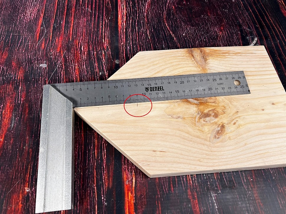 Теперь переходим к разметке деталей для скворечника своими руками. На передней и задней стенках будущего домика нужно найти середину доски. Отмечаем центр и проводим ровные линии с помощью угольника.