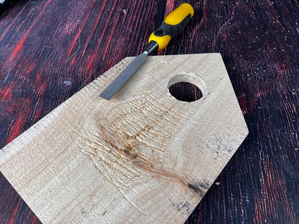 После того как мы сделали леток, не забываем добавить насечки на внутренней стороне передней стенки скворечника. Для этого можно использовать долото (стамеску) или острый нож. Насечки помогут птенцам легко взбираться к летку, когда придет время покидать домик.