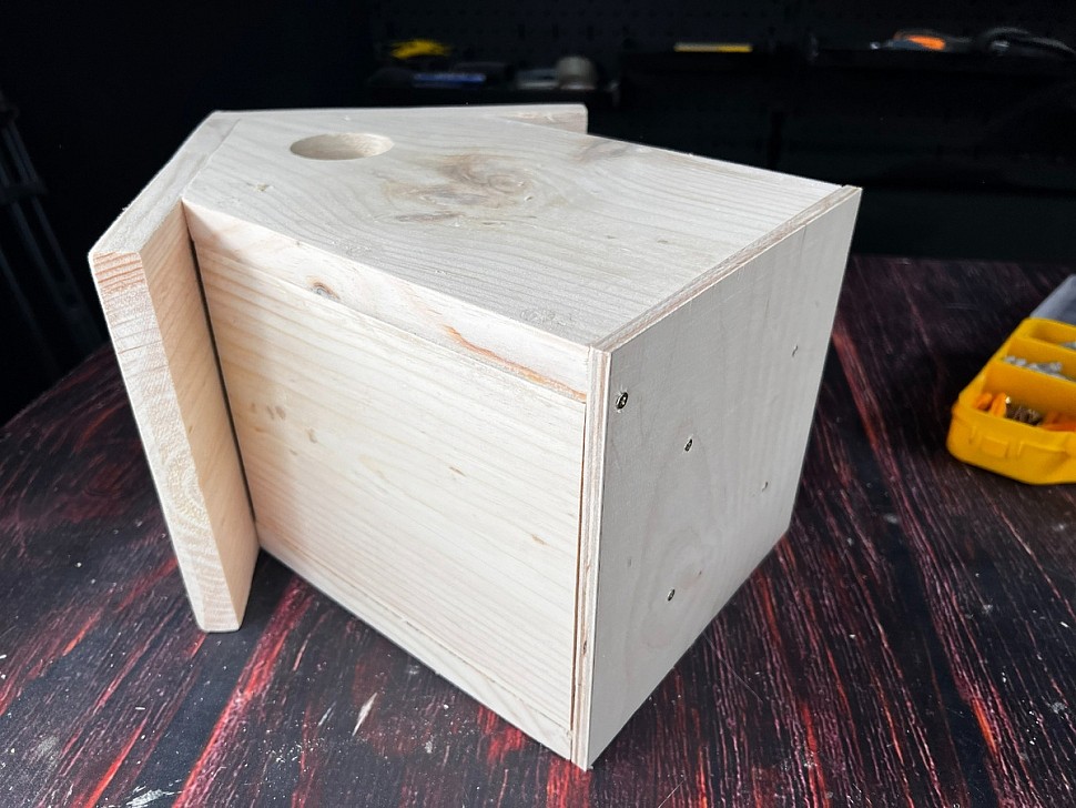 Для этого берем фанерку или доску подходящего размера, вырезаем квадрат и фиксируем его на скворечнике с помощью саморезов. Такой подход делает домик удобным в обслуживании, долговечным и безопасным для будущих жильцов.