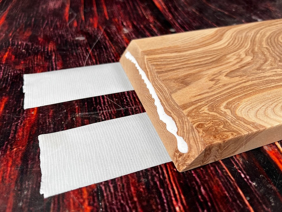 Дальше начинается магия сборки. Никаких саморезов, они тут лишние, нагрузка на подставку совсем небольшая. С задачей отлично справится обычный клей ПВА. Но важный совет: заранее наклейте малярную ленту на поверхность под заготовками.