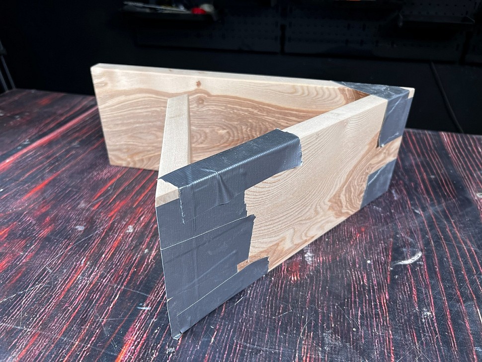 Наносим клей, соединяем заготовки и чтобы сохранить угол и не ловить детали по всему столу, просто фиксируем их лентой. Да-да, обычная липкая лента или малярный скотч тут справляется на ура: держит крепко, а когда клей сделает свое дело снимается без следа.