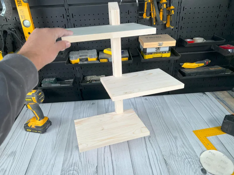 Проверяем, все ли подходит и надежно держится. Кстати, полки просто вставляются в пазы, именно поэтому мы так плотно сжимали бруски в начале — чтобы полки идеально встали на свое место и не болтались.