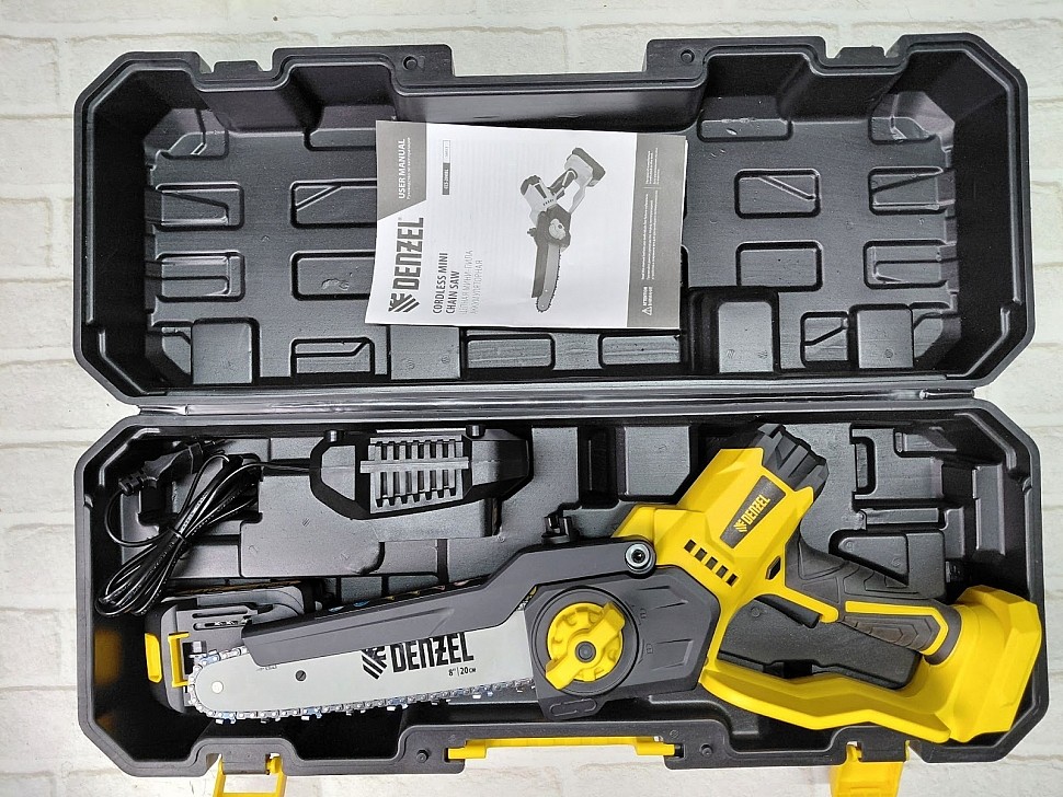 Цепная мини-пила DENZEL СCS-200BL поставляется в пластиковом кейсе.