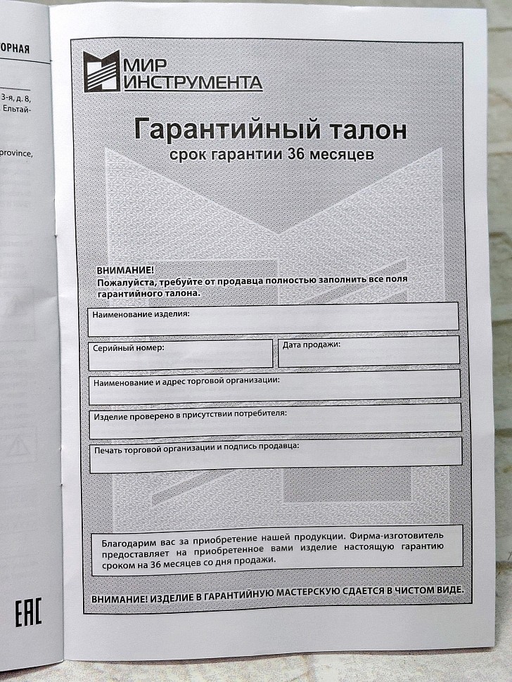 Комплект поставки включает в себя руководство по эксплуатации полностью на русском языке. Гарантийный талон на 36 месяцев расположен на последних страницах.
