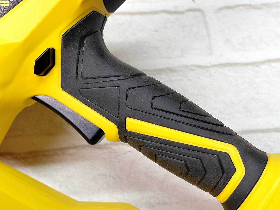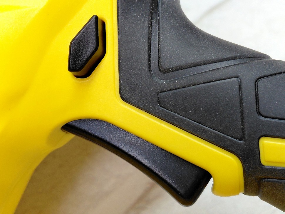 Двухкомпонентная обрезиненная рукоятка с перфорацией для крепкого хвата рукой. Пусковая кнопка с защитой от случайного нажатия.