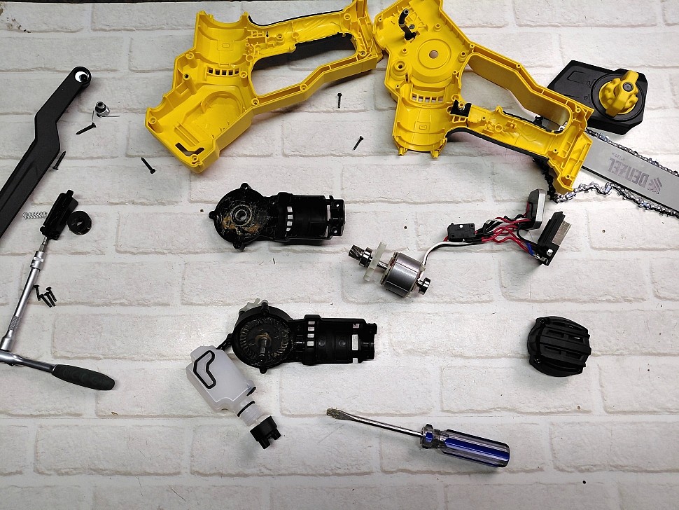 Для полной разборки цепной мини-пилы DENZEL СCS-200BL вам потребуется звезда TORX Т10 и плоская отвертка.