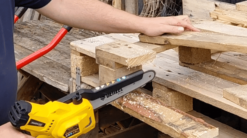 Мини пила отлично справляется с досками от паллета толщиной 20мм.