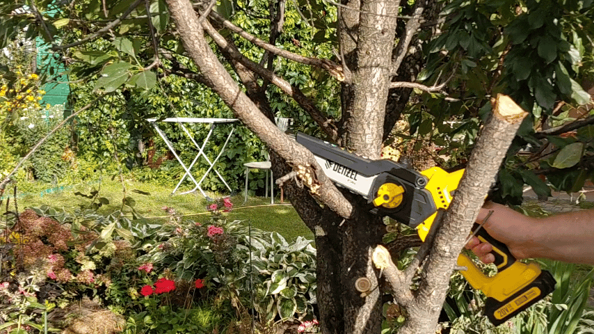 Если требуется полностью спилить садовое дерево, с мини-пилой весь процесс не займёт много времени.