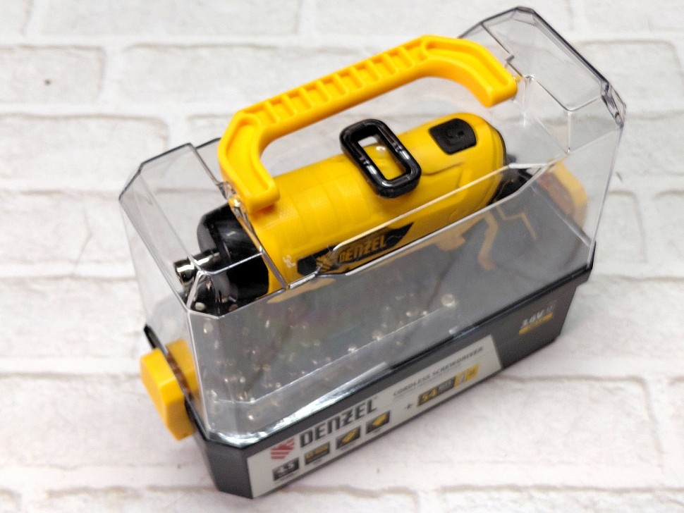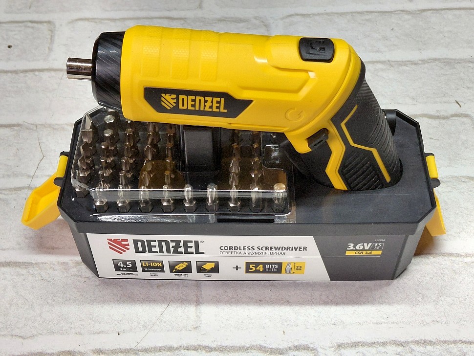 Аккумуляторная отвертка DENZEL CSH-3.6 компактная и удобная для небольших работ, но при этом и достаточно мощная для разового применения с крупными саморезами. А набор бит позволит разобрать практически любое экзотическое устройство.