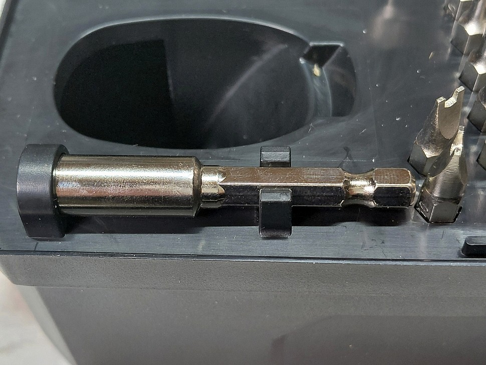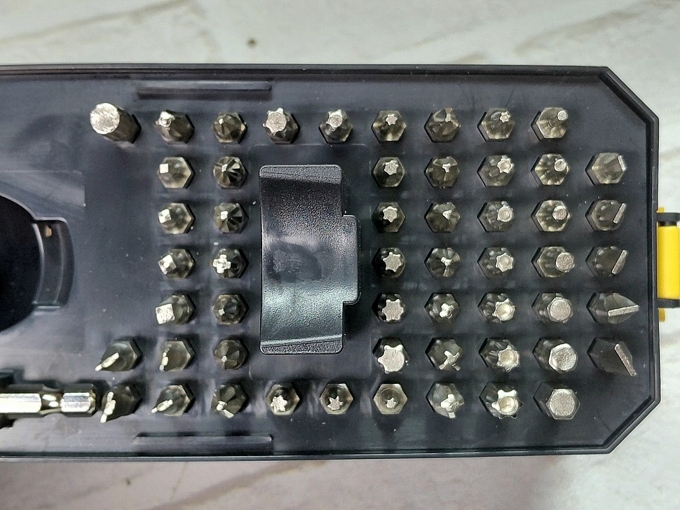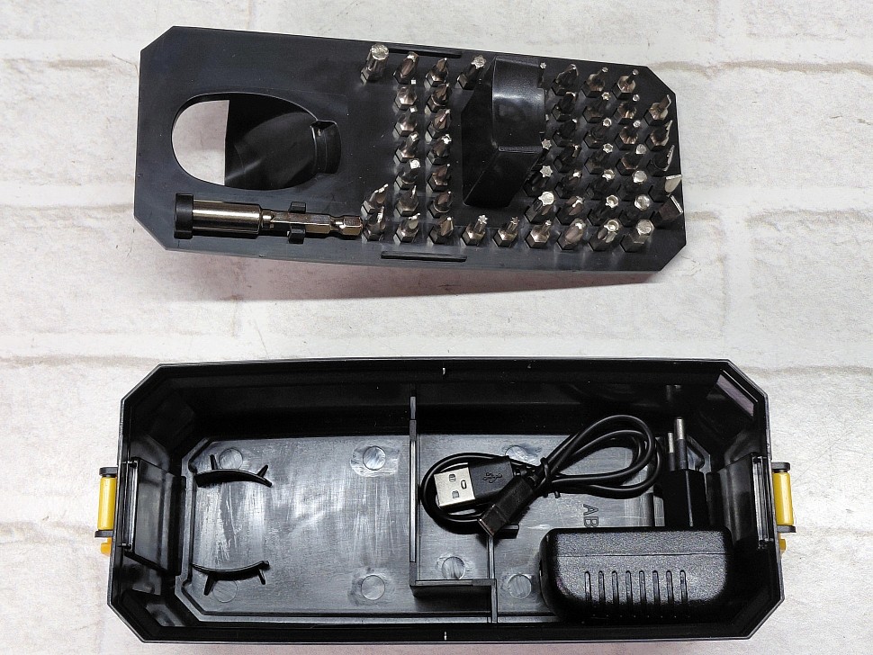 Верхняя часть кейса снимается и получаем доступ к отвертке и битам.