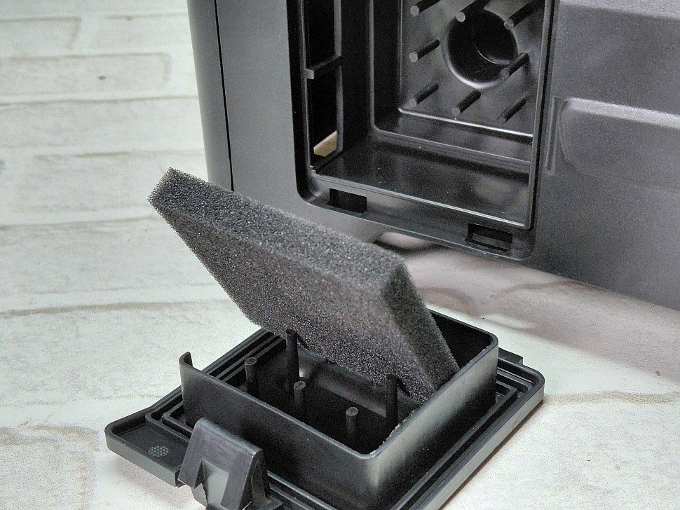 Под панелью управления расположен отсек воздушного фильтра. Фильтрующим элементом выступает поролоновая губка.