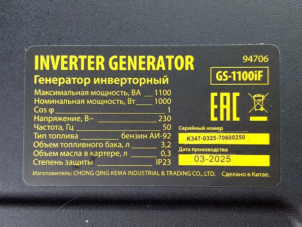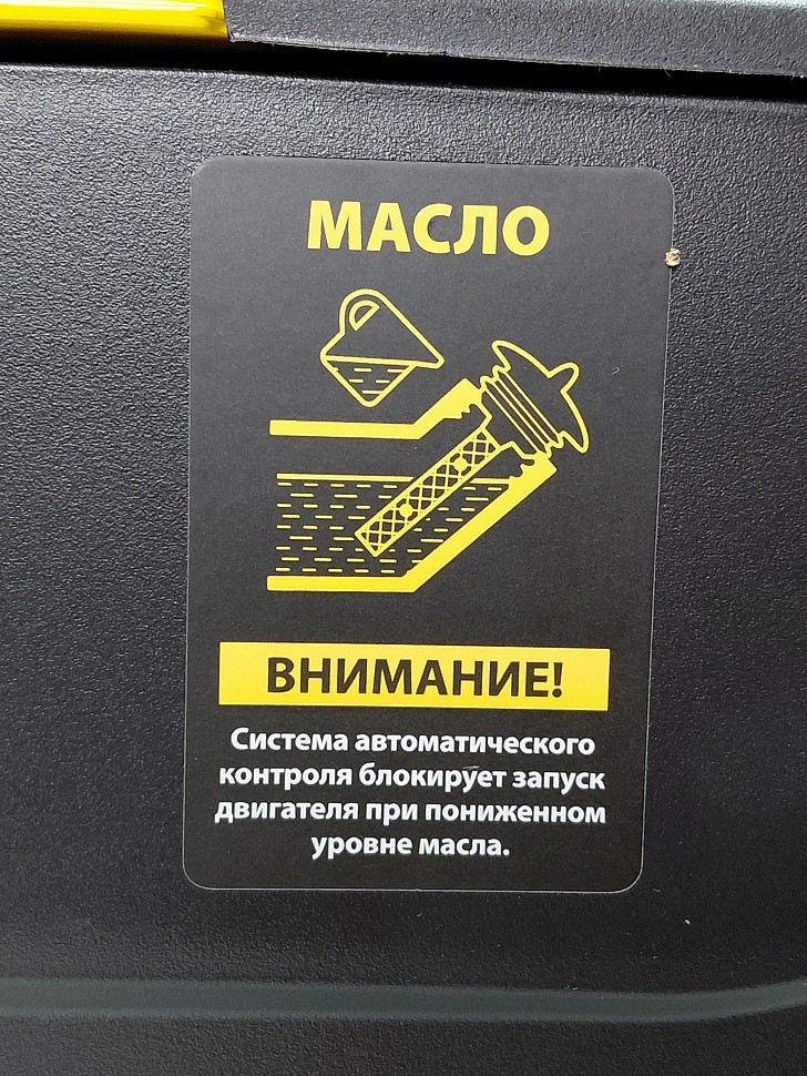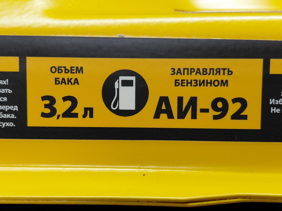 Сверху расположен топливный бак с ручкой для переноски. Информационная наклейка с основными техническими характеристиками, серийным номером и датой производства.