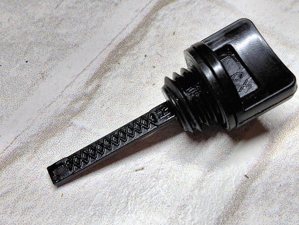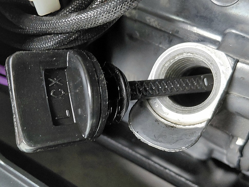 Масляный щуп вставлен в заливную горловину, слева от неё маркировка двигателя.