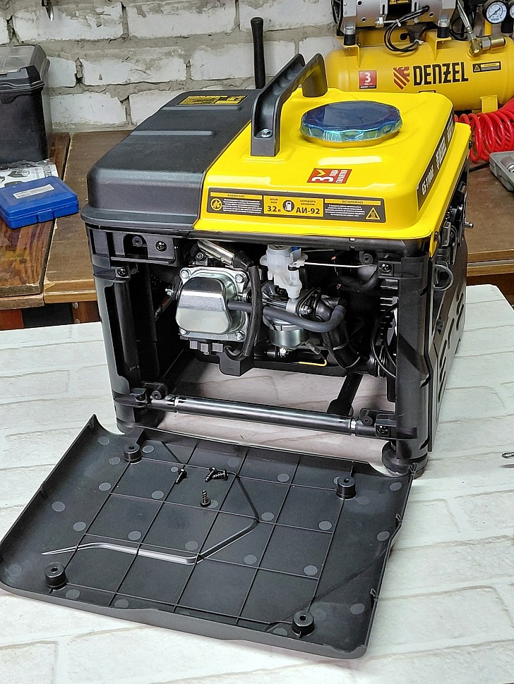 Для обслуживания инверторного генератора Denzel GS-1100iF потребуется снятие боковой пластиковой крышки. Она держится на четырёх винтах под фигурную (крестообразную) отвёртку.