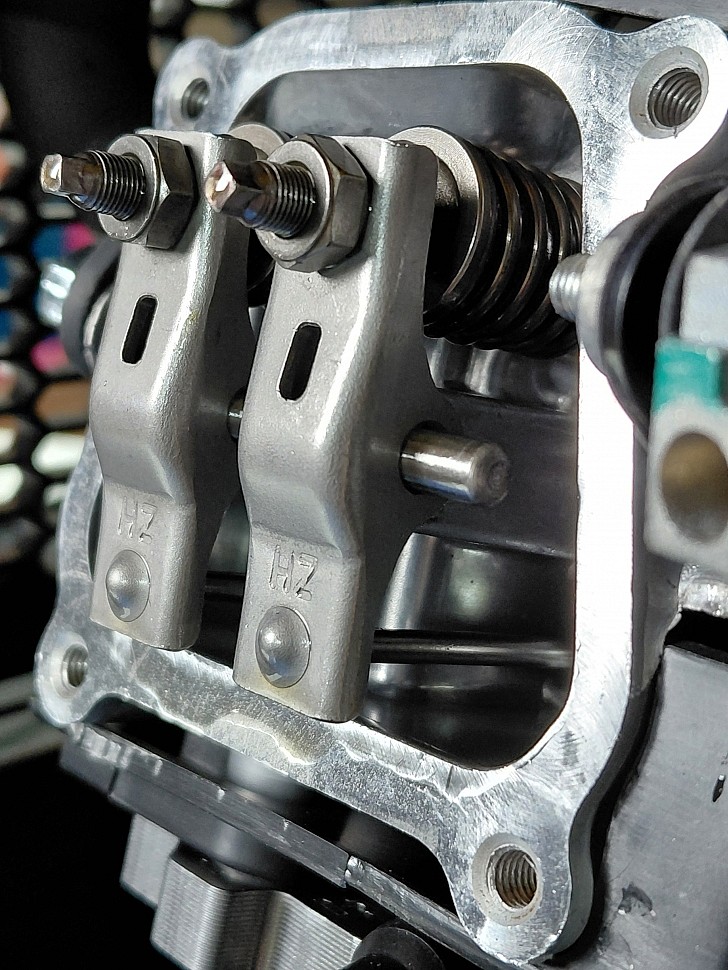 Под клапанной крышкой можно наблюдать коромысла с возможностью регулировки зазора клапанов.