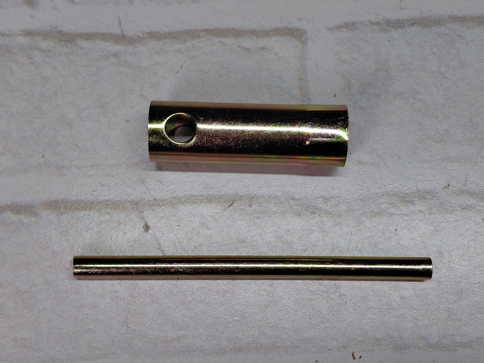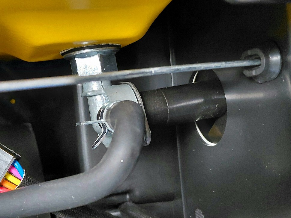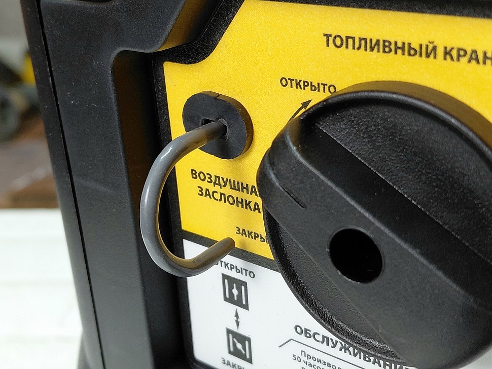 Тяга управления воздушной заслонки карбюратора для холодного пуска. Рядом расположен топливный кран на дне бака. У бака в месте крепления топливного крана небольшое углубление, что позволяет полностью истратить всё топливо в баке.