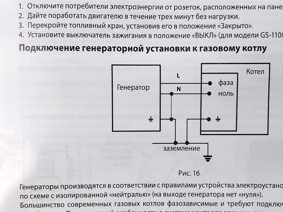 К примеру, требуется запитать фазозависимый газовый котёл с очень чувствительной платой управления. Обязательно делаем заземление и подключаем его к генератору.