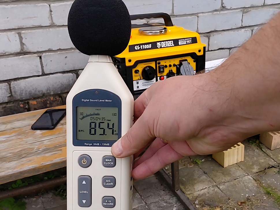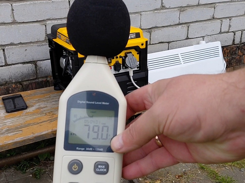 Инверторный генератор Denzel GS-1100iF потвердел заявленные характеристики, без нагрузки показав уровень шума 79дБ.