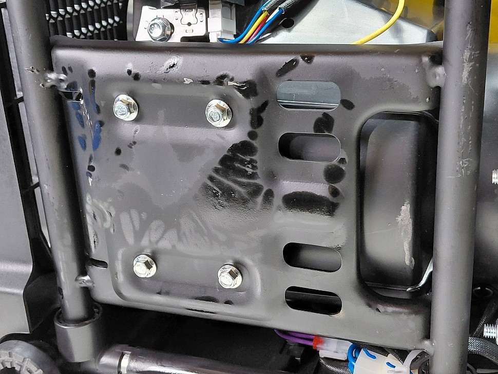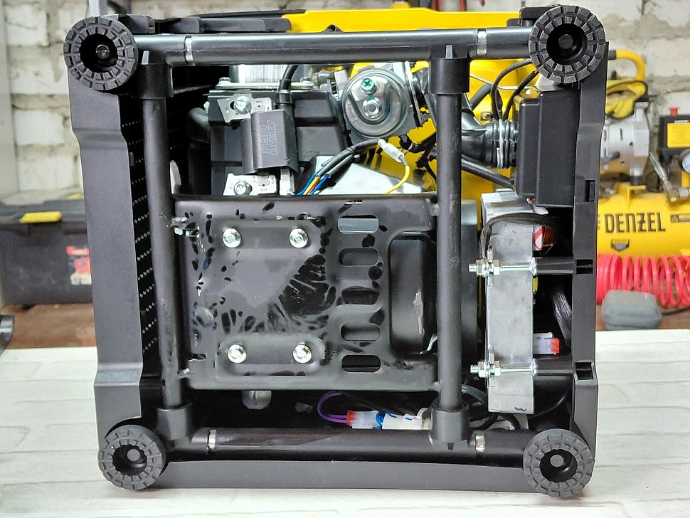 Вид снизу на генератор, видна стальная рама с массивной металлической пластиной по центру, что предаёт отличную жёсткость всей конструкции.