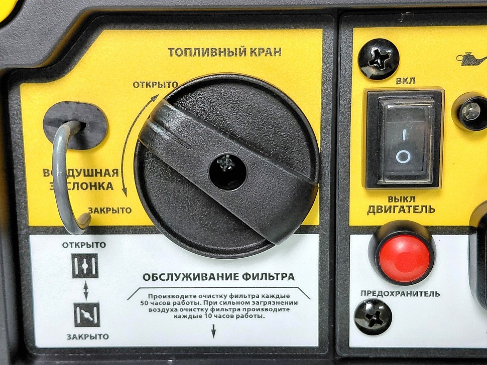 Панель управления, топливный кран необходимо закрывать, когда генератор находится в режиме простоя и не работает.