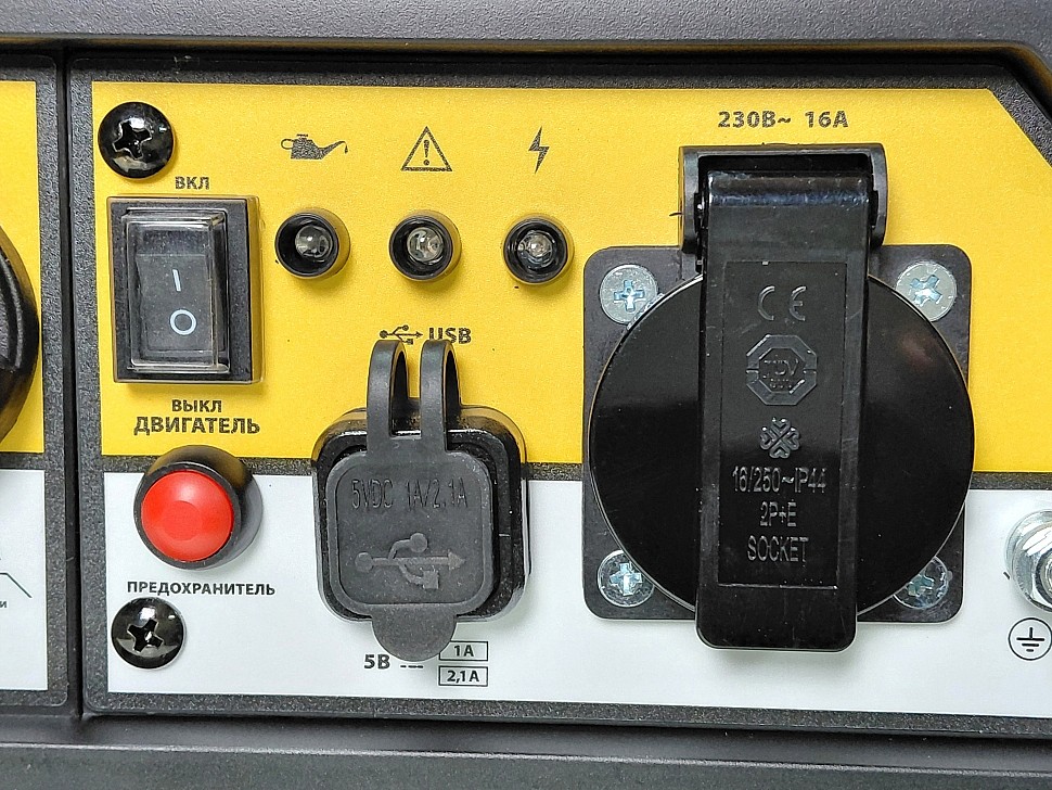 Кнопка вкл/выкл двигателя (зажигание), под ней кнопка сброса предохранителя переменного тока 230В. Три лампы индикации, левая низкий уровень масла, средняя индикация перегрузки, правая индикация работа генератора.