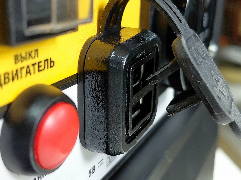 Две USB-A розетки на 5В верхняя на 1А, нижняя на 2.1А. Резиновая крышка плотно закрывает разъёмы во избежание попадания в них мусора.