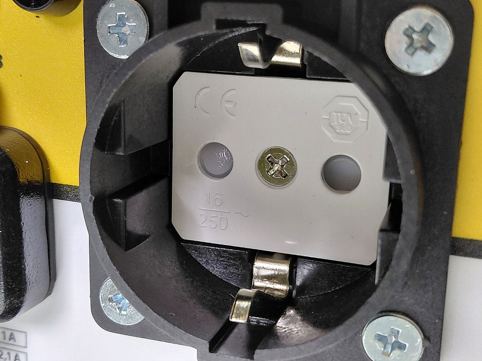 Розетка на 230В помимо основной крышки, оснащена дополнительными шторками на основных контактах.