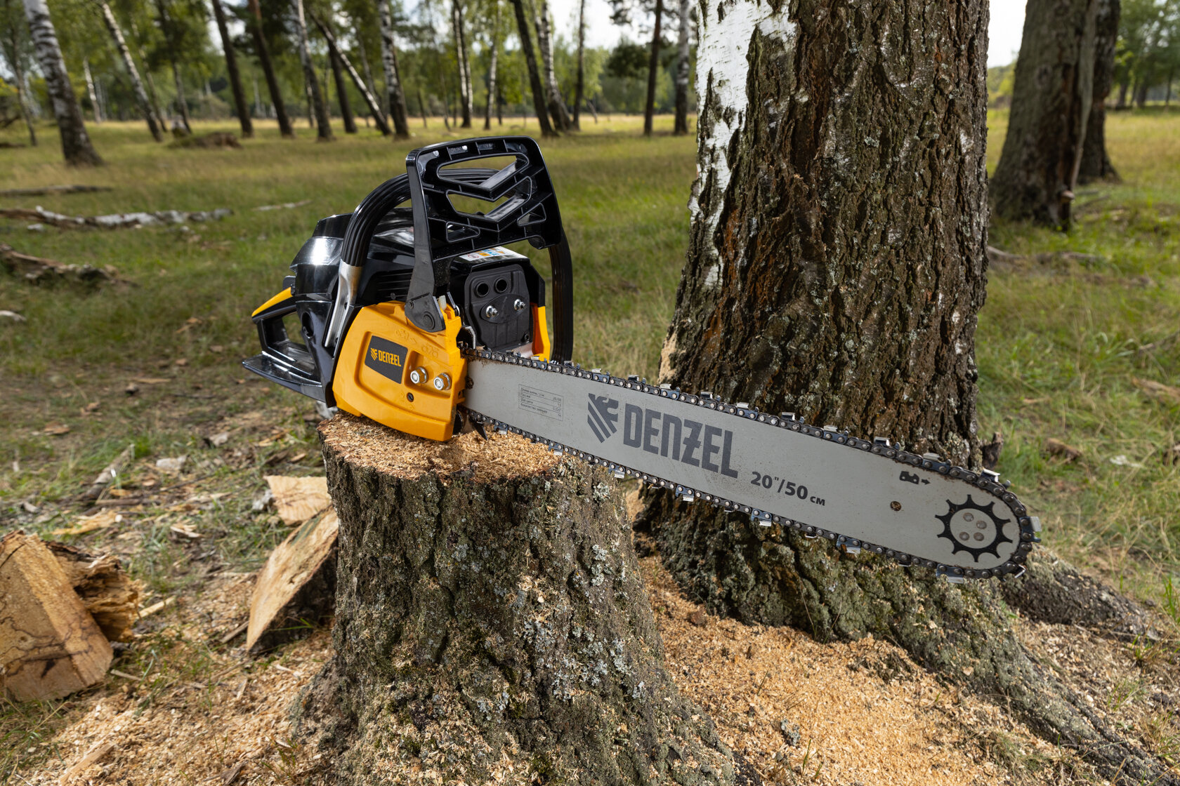 Направляющая шина и пильная цепь. Пожалуй, наиболее важные элементы. Именно благодаря им этот инструмент является пилой в прямом смысле слова. На DGS-5820 длина шины составляет 50 см, это позволяет эффективно применять инструмент для валки крупных деревьев и распиловки бревен большого диаметра из твердых пород древесины.