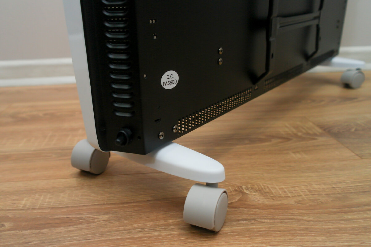 Я же планирую использовать конвектор в качестве мобильного обогревателя, поэтому собираю штатные опоры с колесиками. Колеса не имеют фиксатора, и это стоит учитывать при установке устройства на наклонную поверхность.