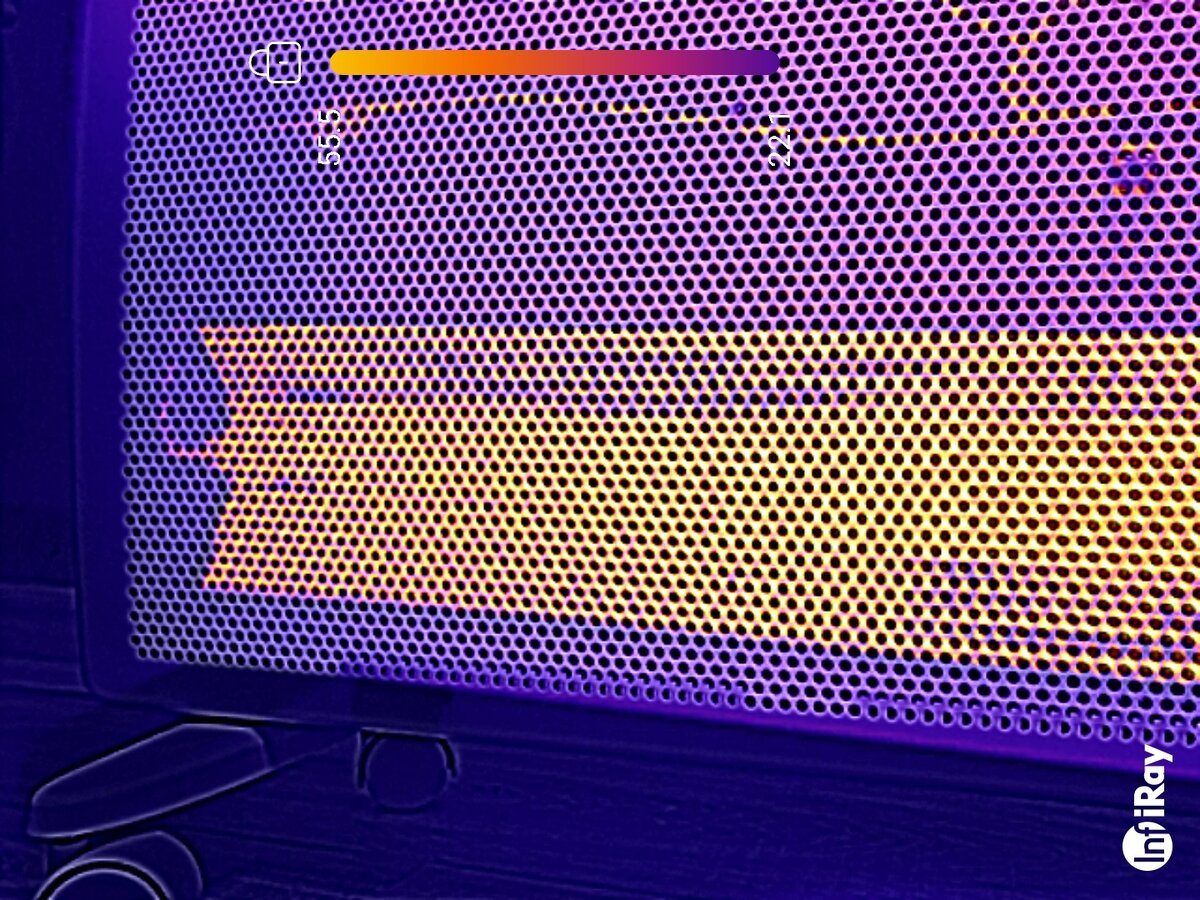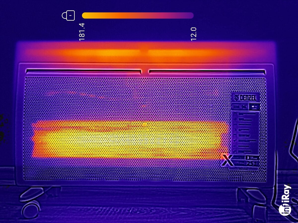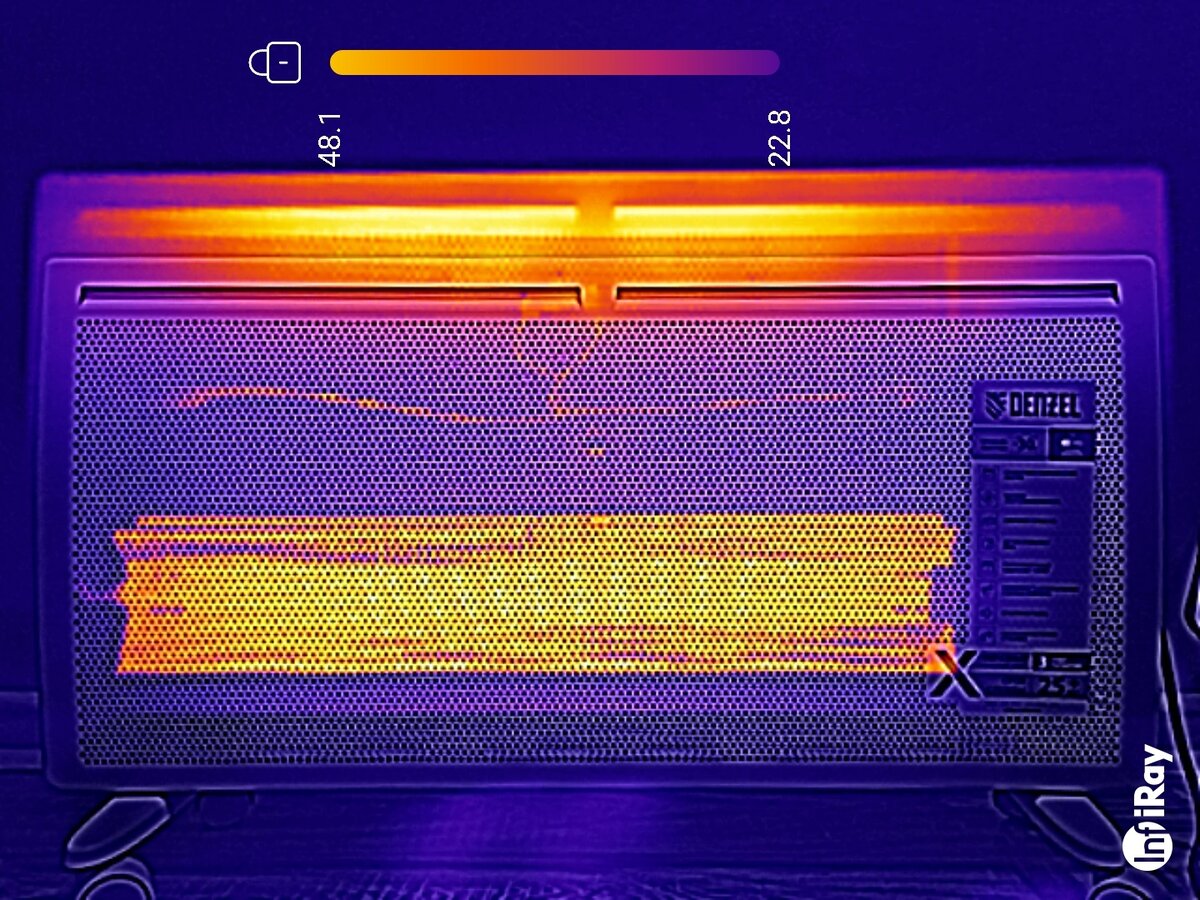 Данный тест был выполнен параллельно предыдущему, поэтому тепловой снимок отображает температуру вначале и в конце процесса нагрева. Производитель заявляет о применении Х-образного нагревательного элемента, в котором объединены два типа обогрева – конвективный и инфракрасный. Инфракрасное излучение нагревает поверхности и предметы, тогда как конвективный способ обогрева распределяет нагретый воздух внутри помещения.