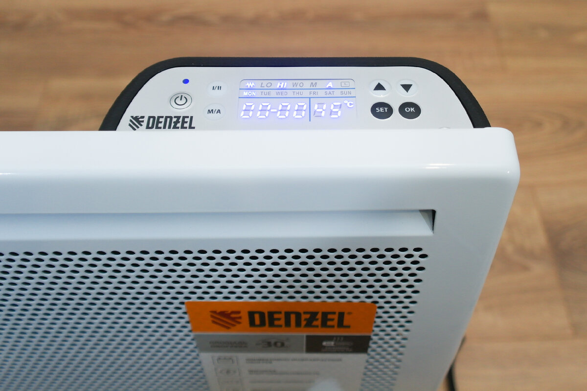 Конвектор Denzel имеет электронный термостат и большой цифровой дисплей в верхней части. Справа и слева от него расположены органы управления, среди которых есть интересные функции: