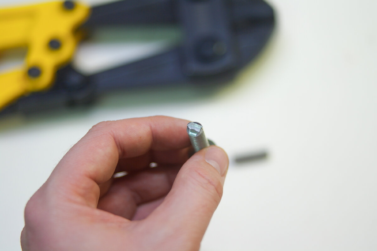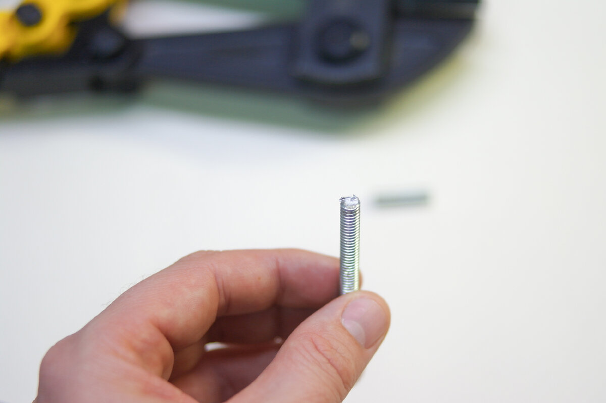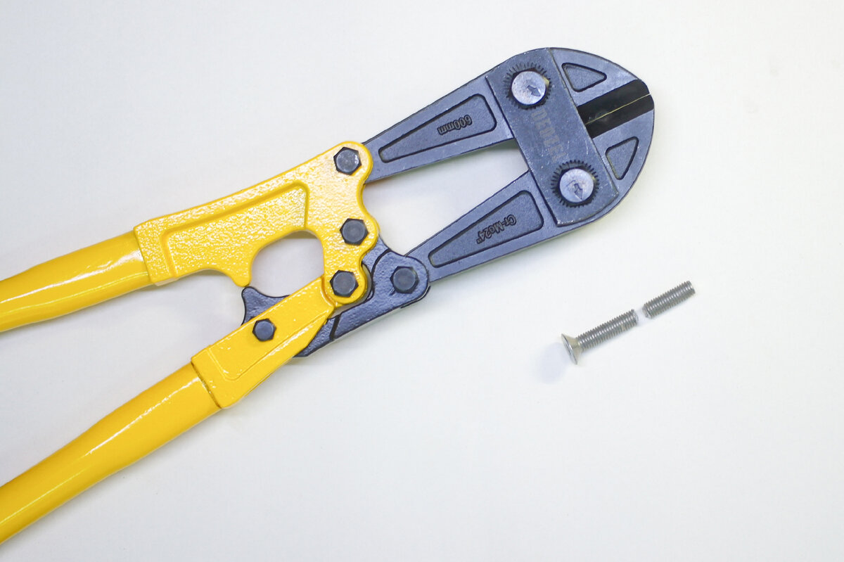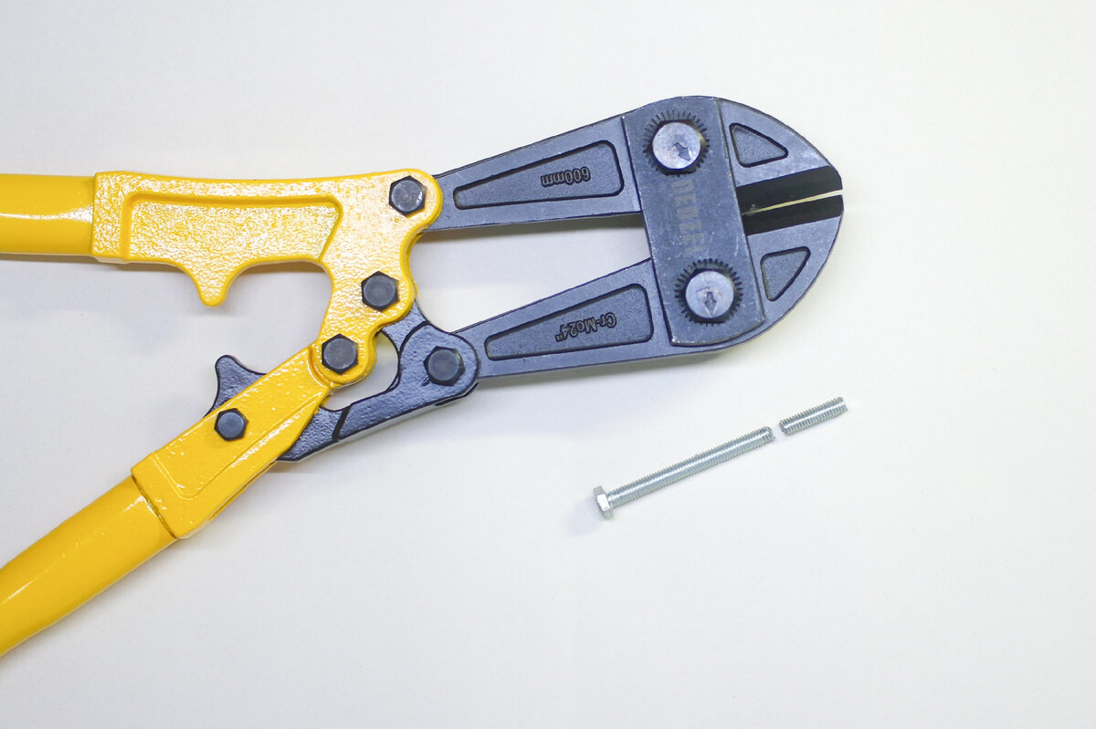 Для теста возьмем болт 6 мм и попробуем перекусить. Губки болтореза разрезают болт как нож масло.