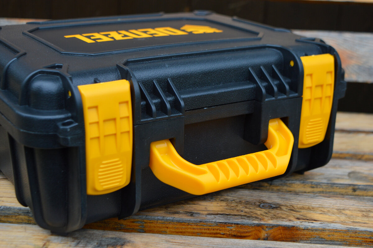 Кейс выполнен из крепкого пластика и имеет удобную ручку для переноски, две защелки удерживающие крышки и металлический шарнир. Внутри кейса размещен мягкий поролон с индивидуальными вырезами под все элементы.
