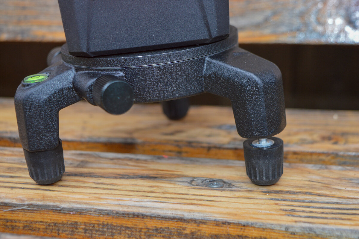 Уровень закреплен на металлической платформе с регулируемыми по высоте ножками. Это позволяет компенсировать неровности поверхности во время его настройки. На платформе установлен пузырьковый уровень, упрощающий момент поиска горизонтали и регулировки ножек. Рядом с пузырьковым уровнем находятся винты точной регулировки, вращая которые, достигается плавная регулировка по вертикальной оси на значительном отдалении луча.