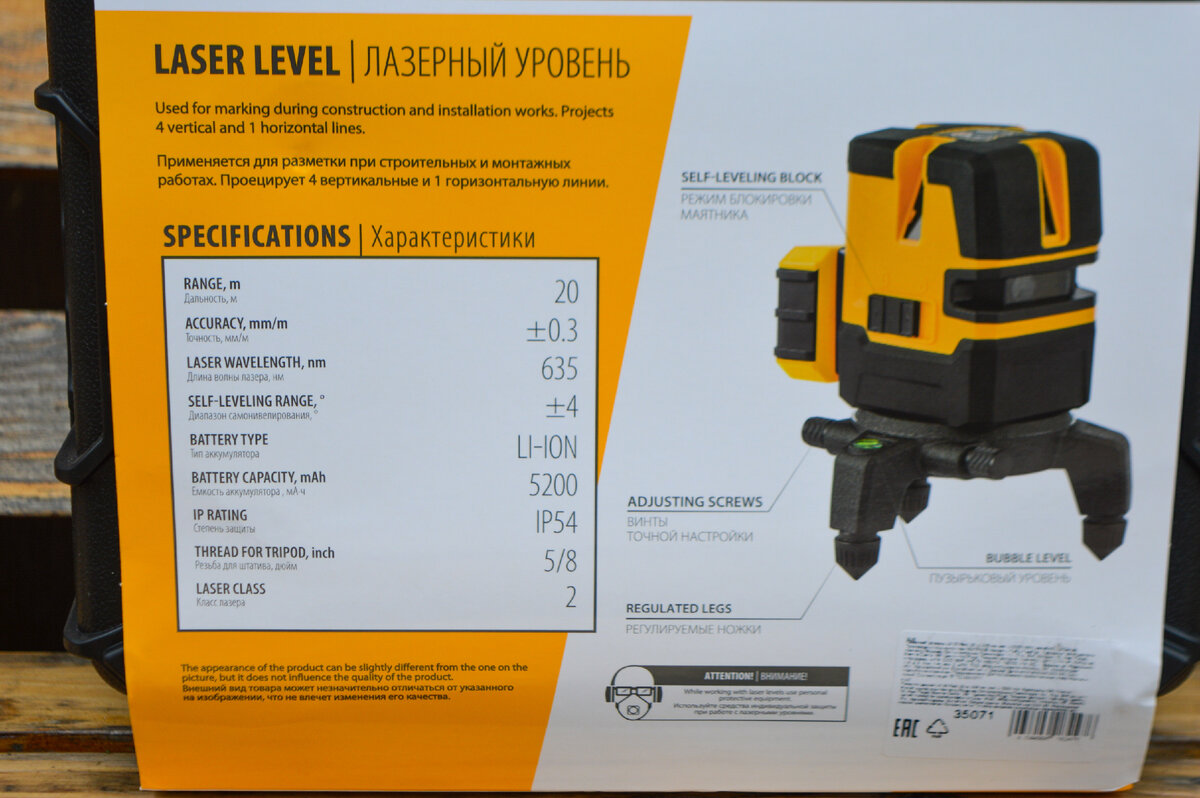 Лазерный уровень поставляется в пластиковом кейсе с картонным шубером, на котором изображено устройство и перечислены основные возможности. Причем они выделены в пиктограммы, поэтому сразу же бросаются в глаза. Благодаря этому можно мгновенно выделить именно те параметры, которые вам требуются. С тыльной стороны краткие технические характеристики.