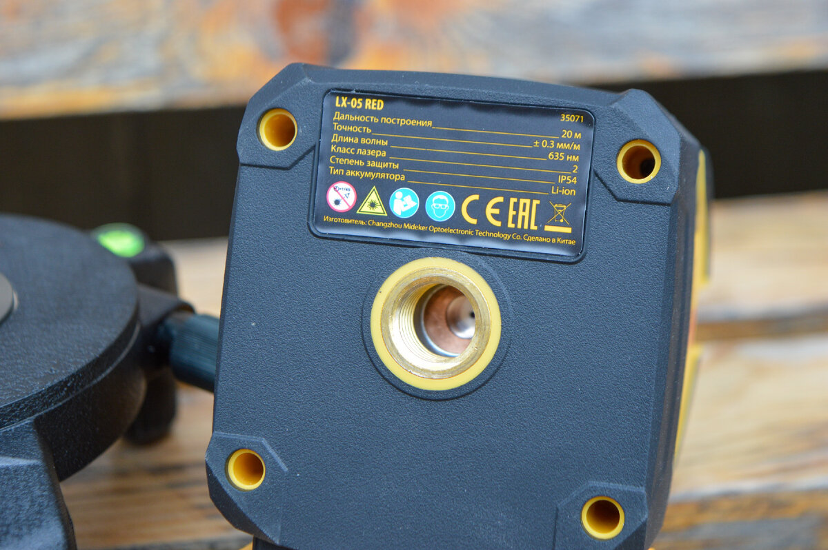 При необходимости металлическая платформа может быть демонтирована, например, для установки уровня на штатив или вертикальный подвес. На нижней платформе лазерного уровня небольшая наклейка с краткими техническими характеристиками и серийным номером. Кроме того, здесь же лазерный луч для построения отвеса и резьбовое крепление 5/8" к штативу.
