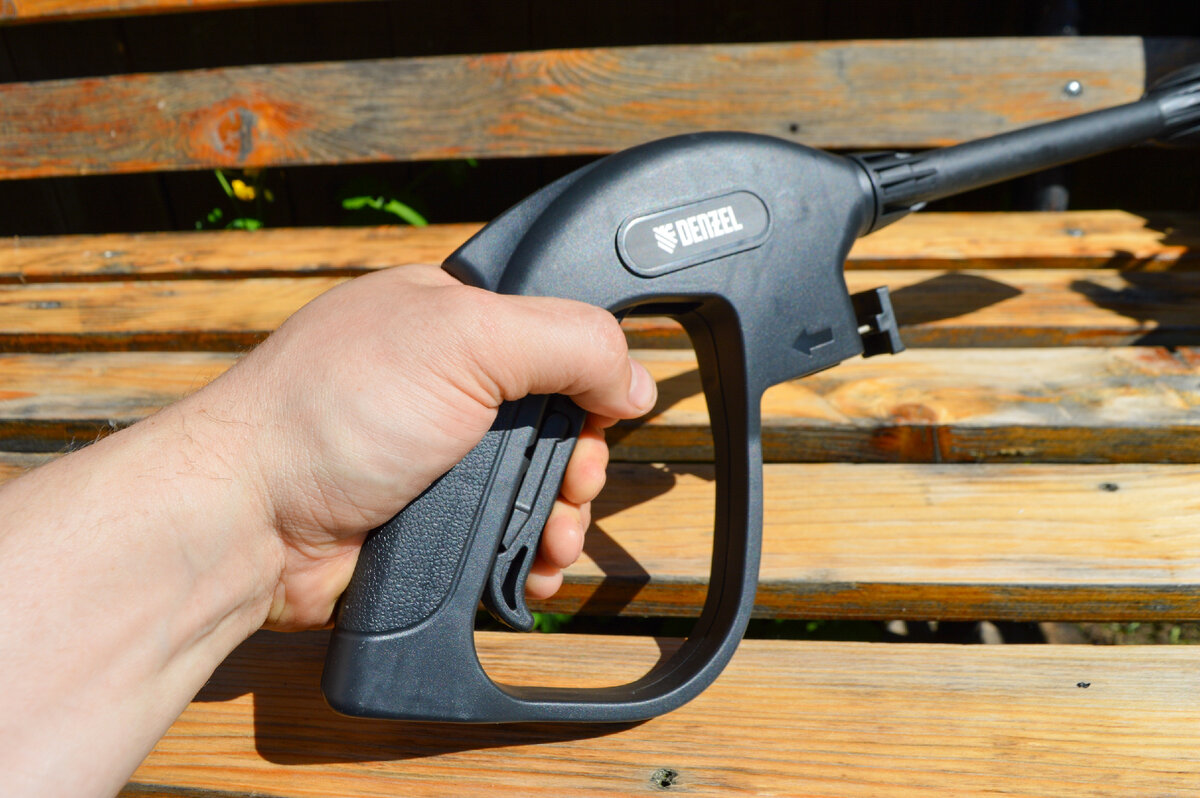 Моечный пистолет удобен для работы даже одной рукой. Курок имеет широкую площадку и позволяет нажимать всеми пальцами руки, благодаря чему не устаешь даже при длительной работе. Под курком расположен блокирующий механизм, оберегающий от случайного запуска.