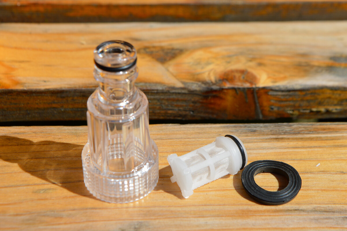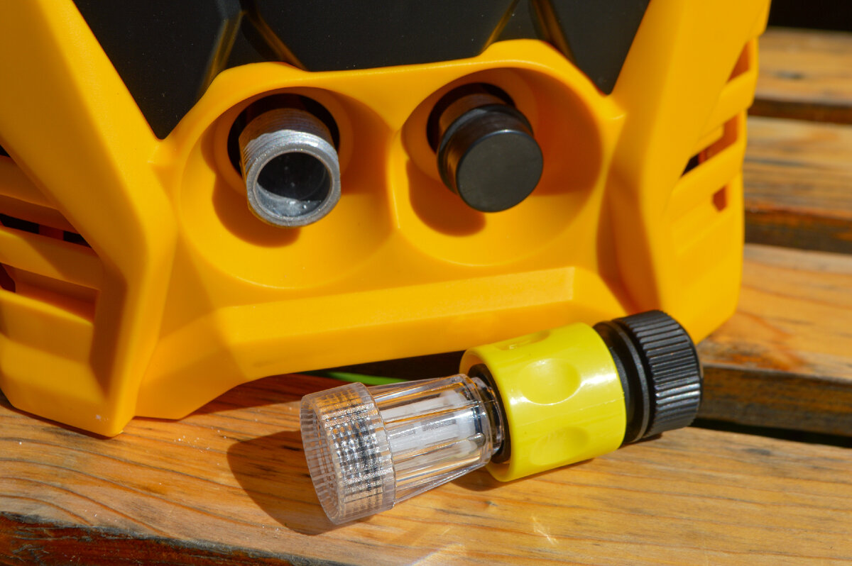 Для подключения DENZEL R-165 к источнику воды предусмотрен быстросъемный адаптер, который подключается к входному штуцеру с фильтром грубой очистки. Даже при недлительной работе фильтр может выловить частички песка или другой грязи. Собственно, чуть ниже это будет видно.