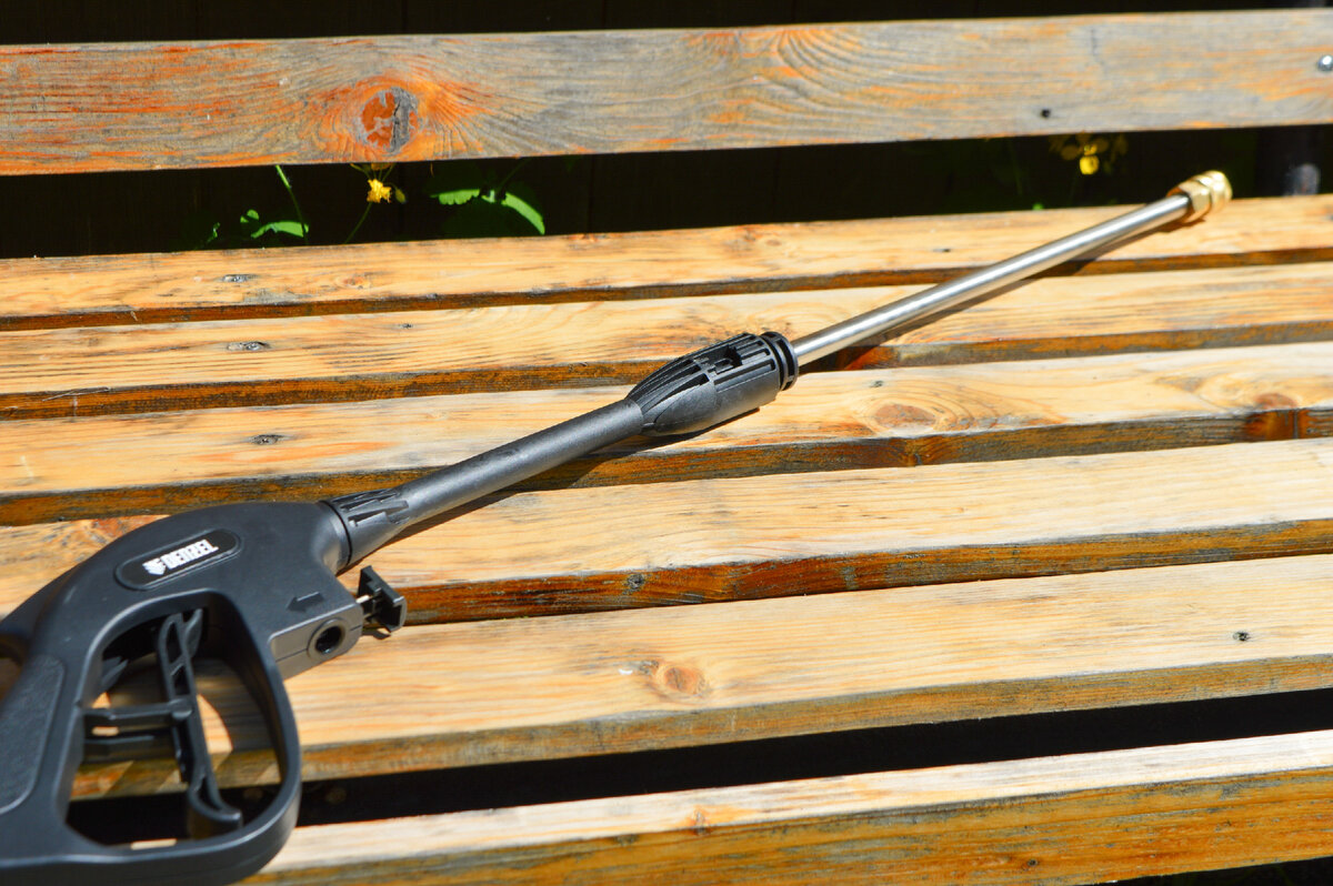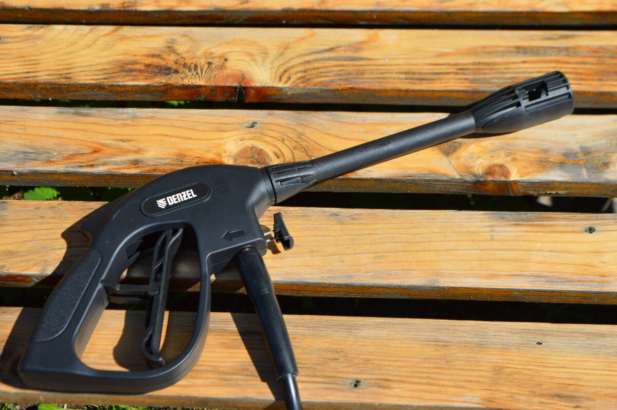 Я могу перечислить несколько моментов, почему я выбрал именно DENZEL R-165. Во-первых, простота сборки и подключения шлангов, так как в большинстве случаев используется быстросъемные крепления. Кроме того, на подаче воды уже установлен фильтр. Во-вторых, быстросъемные форсунки, которые не занимают много места и довольно функциональны. Насадки при работе можно держать в кармане и заменять при необходимости.