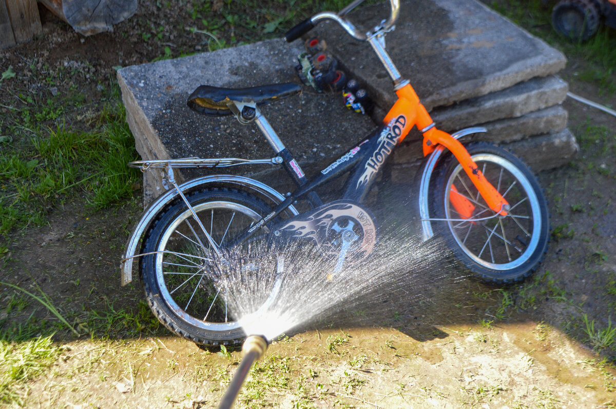 Сопло-распылитель веерного типа позволяет захватить наибольший участок для мытья. При этом давление воды распределяется равномерно и можно не бояться повреждений. Обычно, я использую только его, так как его хватает, чтобы помыть машину или велосипед. Благодаря широкой рабочей области такой насадкой проще смыть грязь с дорожек.