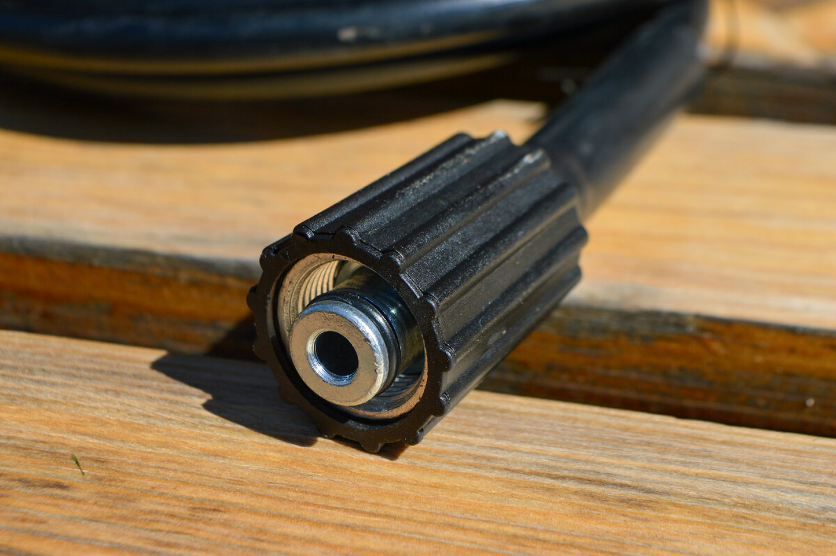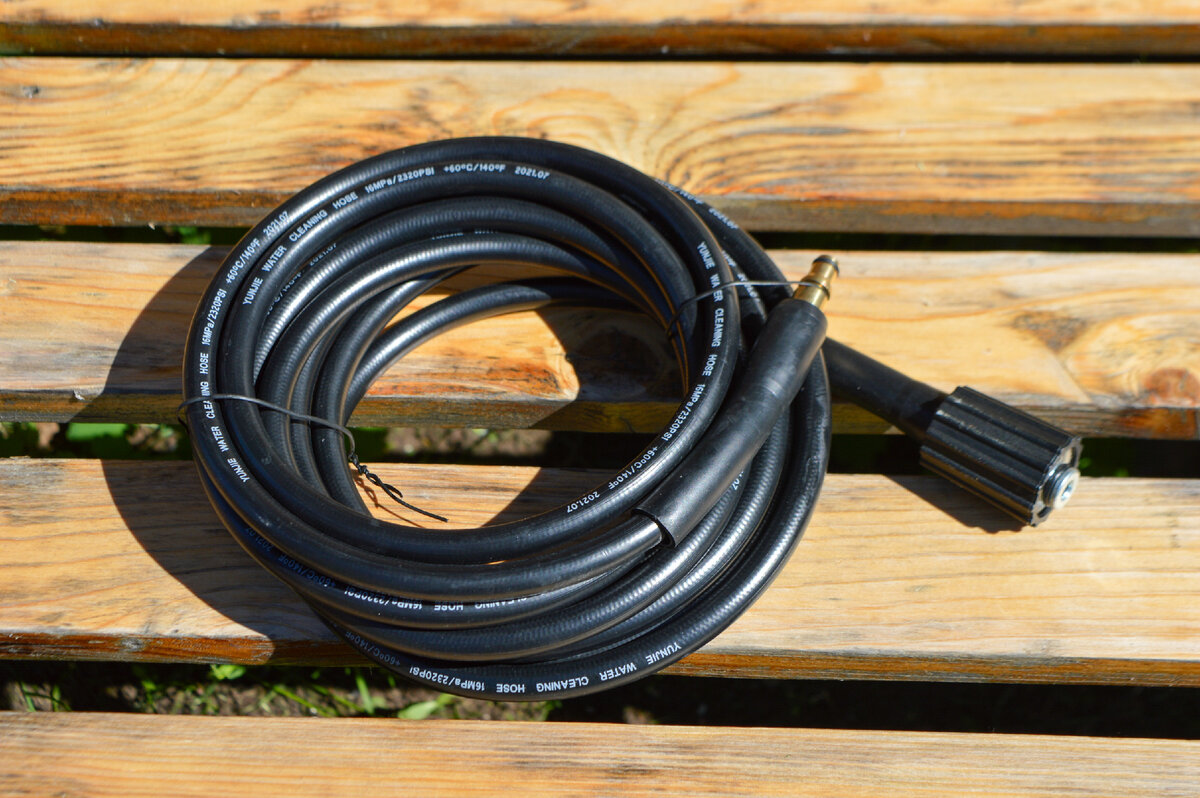 Шланг высокого давления длиной 5 м. Это тот минимум, которого с лихвой хватает, чтобы помыть машину и быть полностью мобильным при уборке территории. Возможно, кому-то покажется он грубоватым, но это все из-за конструкции, позволяющей выдерживать высокое давление. Один конец шланга подключается к пистолету, а другой непосредственно в саму мойку. Резьбовое соединение со стороны мойки имеет уплотнительные кольца.