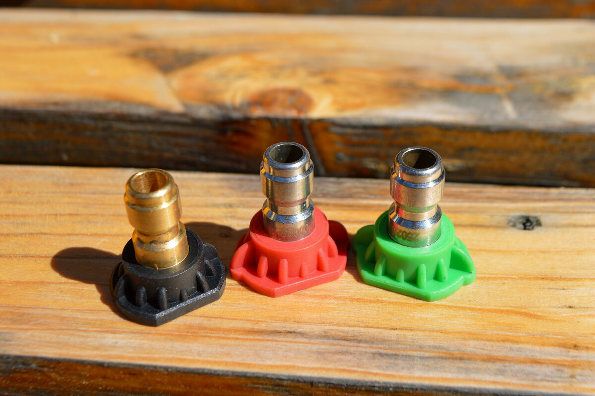 Форсунки изготовлены из металла и имеют индивидуальный цвет рубашки, позволяющий сразу же подобрать нужный тип струи. С мойкой поставляются форсунки с факелами распыла 0о (точечная) и 25о и пенная насадка. Каждая из них подходит для выполнения определенных задач. Для смены форсунок требуется лишь отжать быстросъемное крепление и установить новую насадку.
