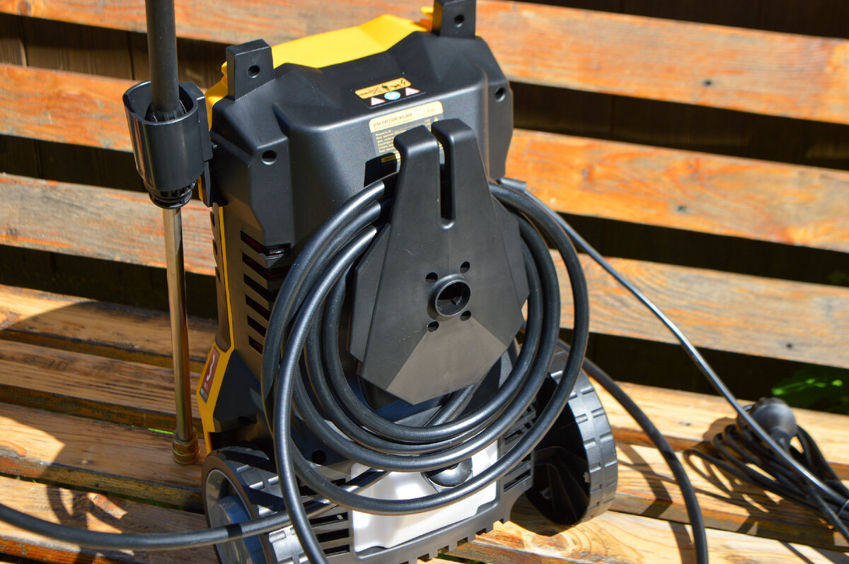 На тыльной стороне мойки разместился кронштейн для хранения провода питания. При компактной намотке провода, на нем с легкостью разместится еще и шланг высокого давления.