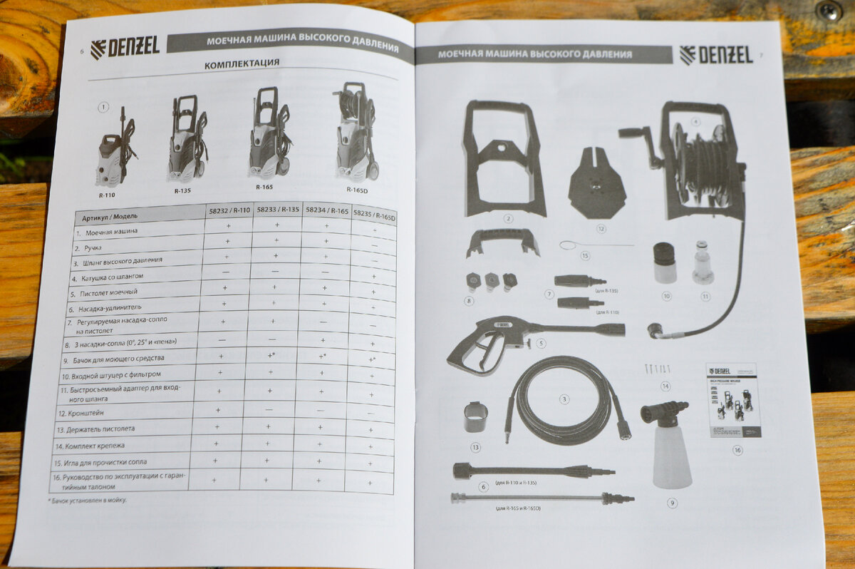 В руководстве по эксплуатации описано сразу 4 модели моек производителя, отличающихся друг от друга мощностью и незначительно по комплектации. DENZEL R-165 является одной из самых мощных моделей в линейке.